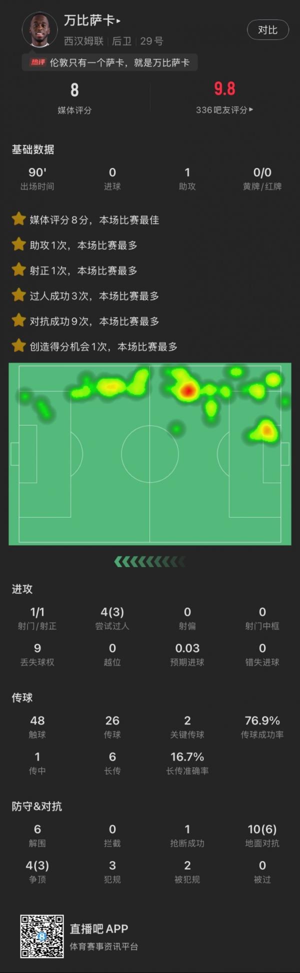 2月23日讯 在刚刚结束的英超比赛中,西汉姆1-0击败阿森纳。本场比赛,曼联旧将万-比萨卡发挥出色,送出1助攻,获评8分全场最高。