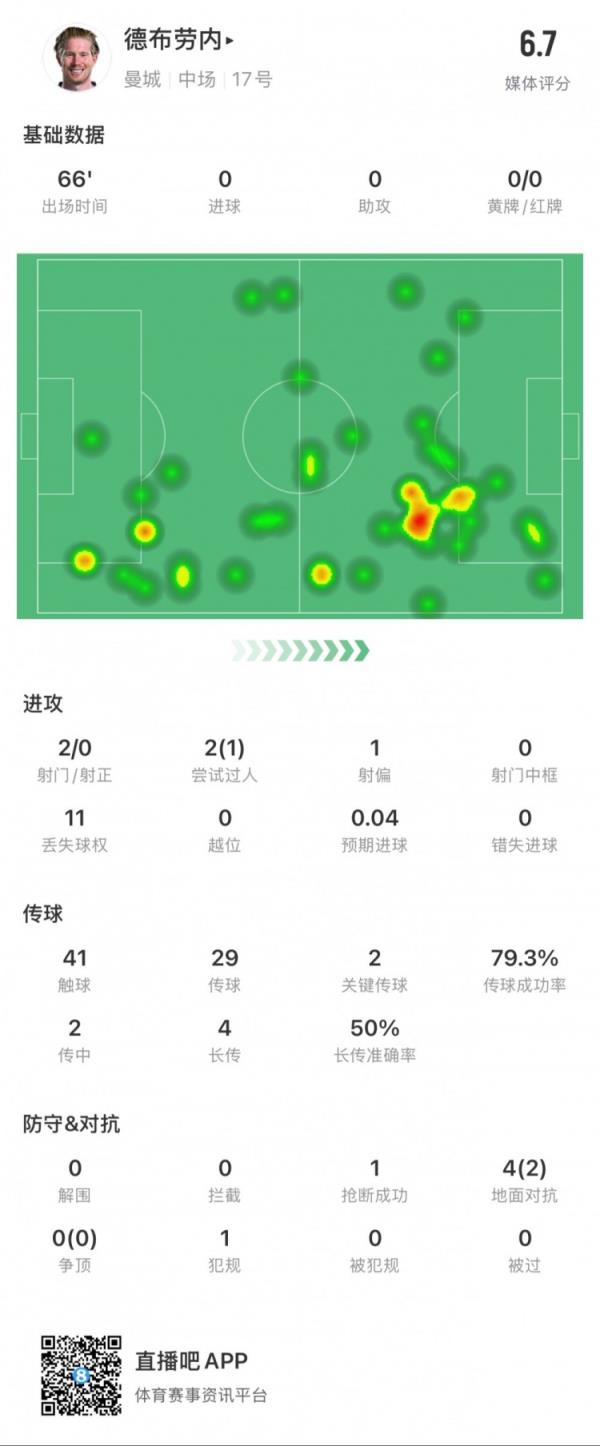 2月24日讯 本轮英超比赛,曼城对阵利物浦,德布劳内本场数据: