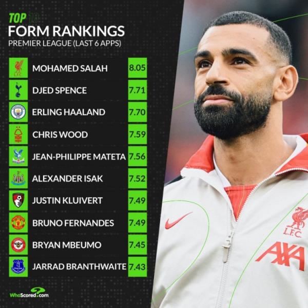 2月26日讯 whoscored统计了近6轮英超球员场均评分情况,萨拉赫力压斯宾塞居首。