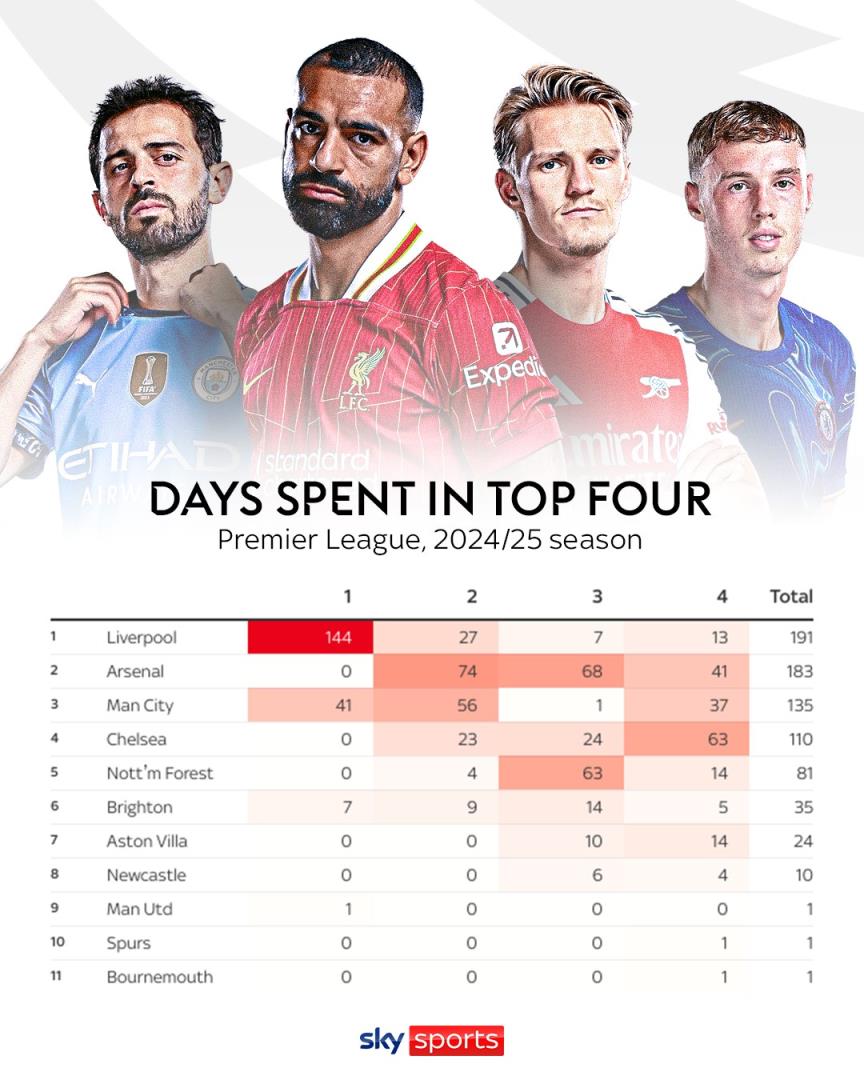 02月26日讯 天空体育统计了本赛季英超前四排名情况,利物浦排名榜首已有144天。