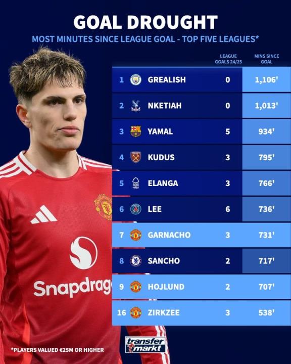 2月26日讯 德国转会市场统计了目前五大联赛的进球荒时间排名,曼联有2名球员进入前十。