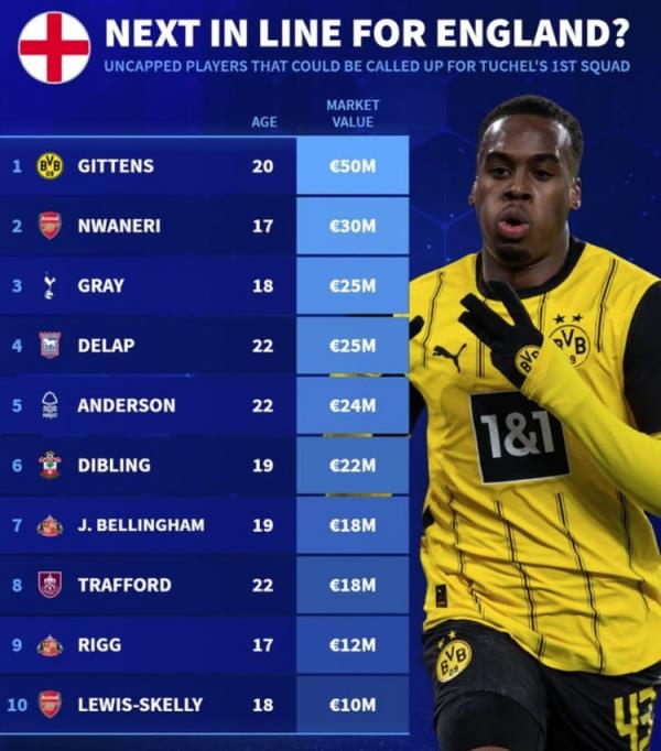 2月27日讯 《转会市场》统计了当前仍未被征召的英格兰球员最贵身价情况,多特边锋吉滕斯领衔。