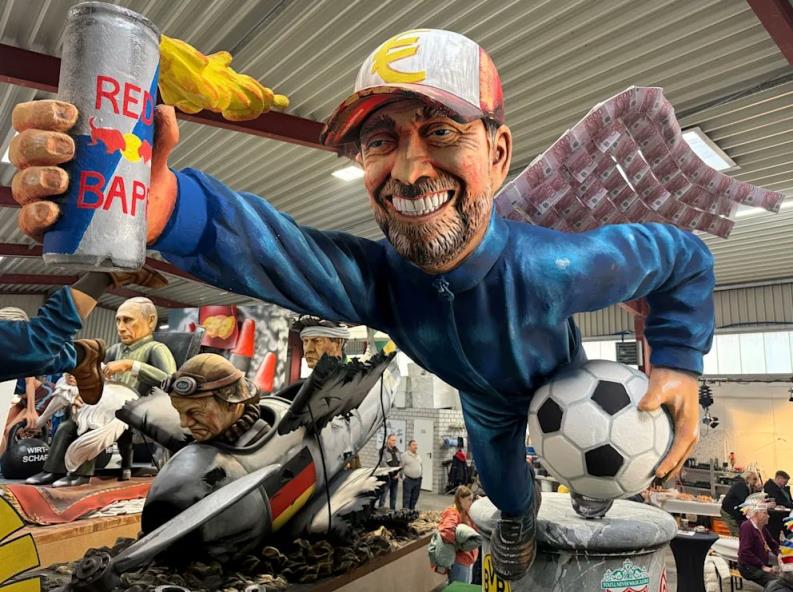 据报道,该彩车上是前美因茨球员和教练克洛普的身影,他的翅膀是用钞票做成的,手里拿着一罐红牛标志性的能量饮料和一个足球。彩车侧面还写道:“对于克洛普来说,他不再关心那些曾经很重要的价值观。由于红牛用大量金钱诱惑他,他现在正从自己的宝座上跌落下来。”