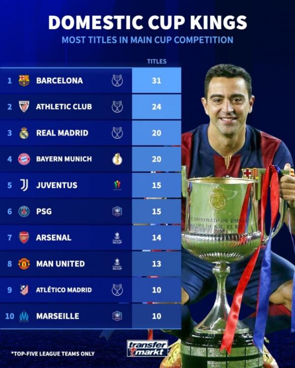 2月28日讯 五大联赛的国内杯赛淘汰赛本周进行中,德转列出了五大联赛国内杯赛夺冠次数榜单,巴萨31次排名第一,毕巴24次排名第二。