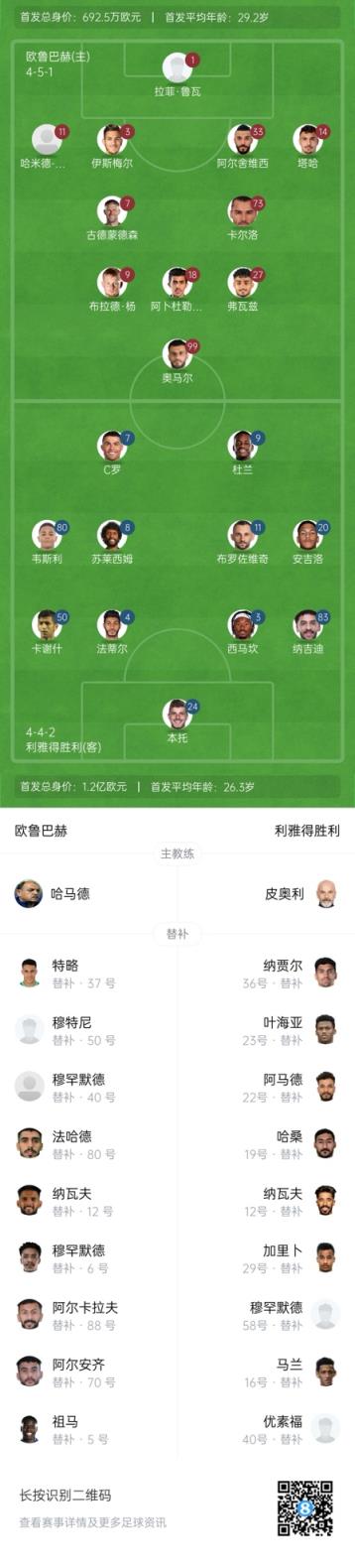 欧鲁巴赫替补:37-特略、50-穆特尼、40-桑奇迪、80-法哈德、12-阿尔卡米迪、6-阿尔卡尼、88-阿尔卡拉夫、70-阿尔安奇、5-祖马