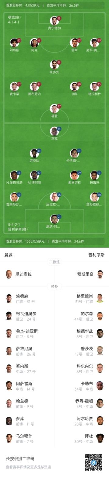 3月2日讯 足总杯1/8决赛,曼城主场迎战普利茅斯,赛前首发名单公布。