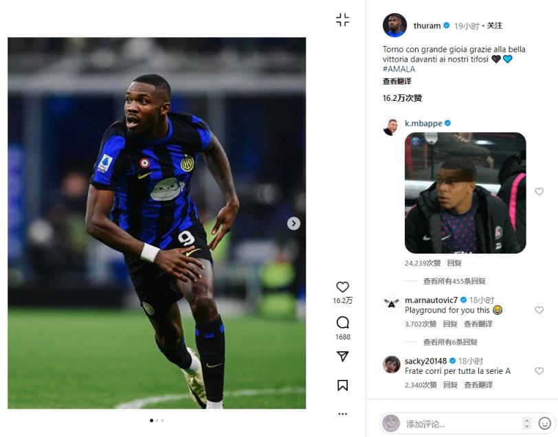 赛后图拉姆更新社媒,晒出了他穿着这款球衣的照片,而一直被调侃为“神龟”的姆巴佩也在这篇帖子下回复,晒出了自己一脸疑惑的表情包。