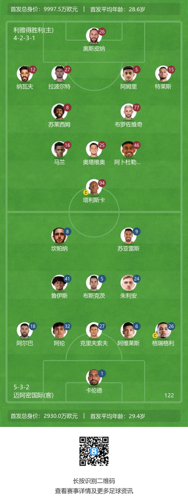 利雅得胜利首发:26-奥斯皮纳、12-布沙尔、5-阿姆里、27-拉波尔特、15-特莱斯、8-苏莱西姆、46-阿利瓦、77-布罗佐维奇、25-奥塔维奥、16-马兰、94-塔利斯卡