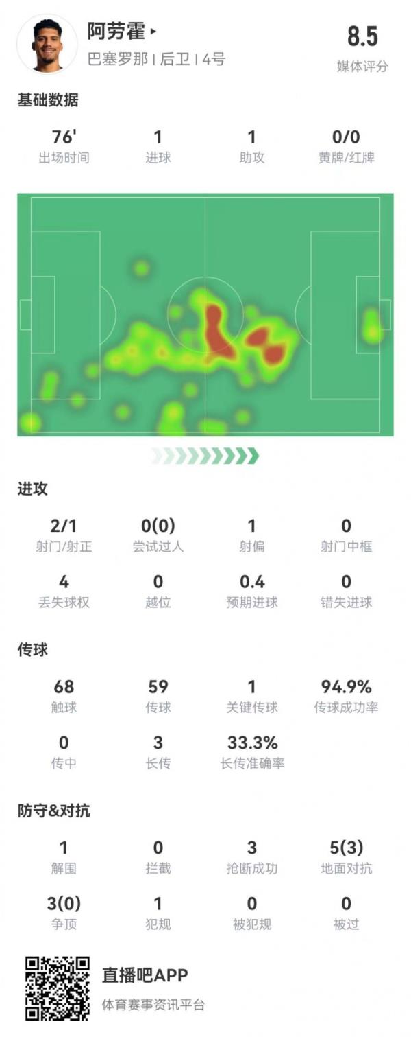 3月3日讯 巴萨在本轮西甲4-0领先皇社,阿劳霍本场数据如下:
