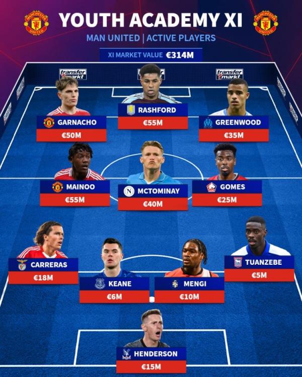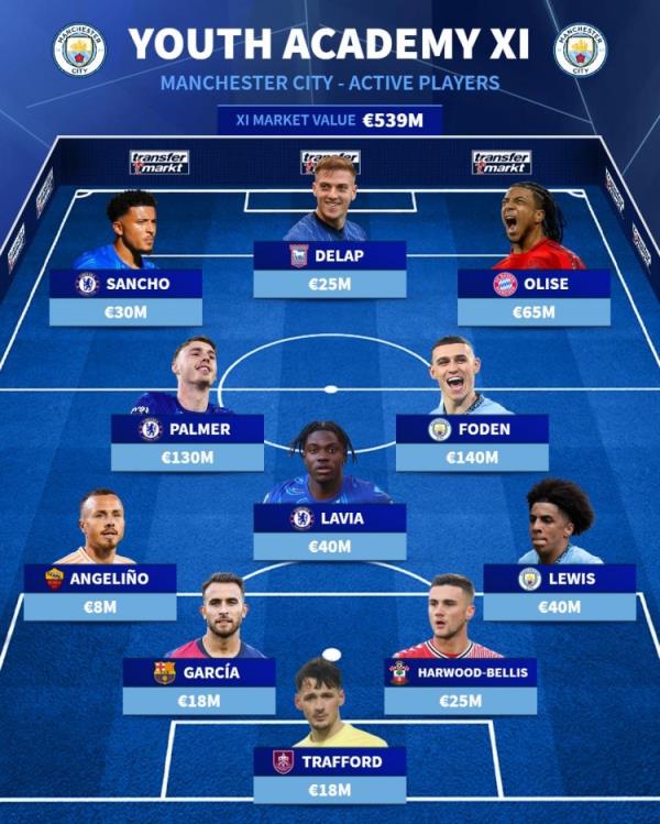 3月3日讯 德转列出了曼联、曼城和利物浦各自青训出品球员的最佳阵容,其中,帕尔默、桑乔、斯特林、奥利塞等人入选。