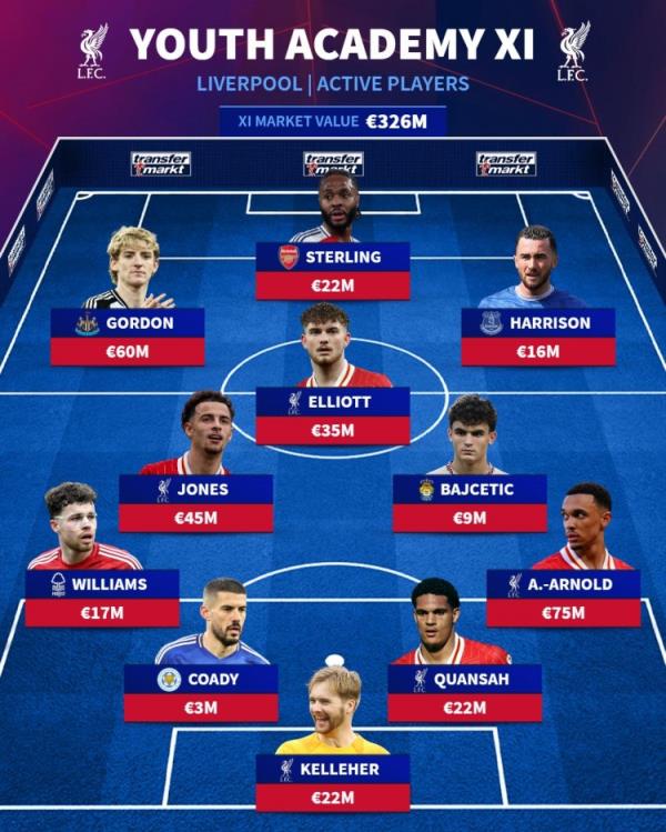 利物浦青训出品球员最佳阵↓(括号内为球员目前效力球队)