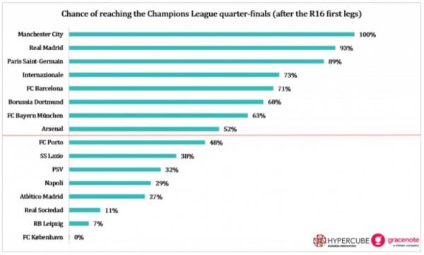 3月6日讯 北京时间今天凌晨4点,欧冠1/8决赛次回合即将打响,其中拜仁主场对阵拉齐奥,大巴黎客场对阵皇家社会。欧洲数据媒体Euro Club Index(ECI)也对各队的晋级概率进行了一个预测。