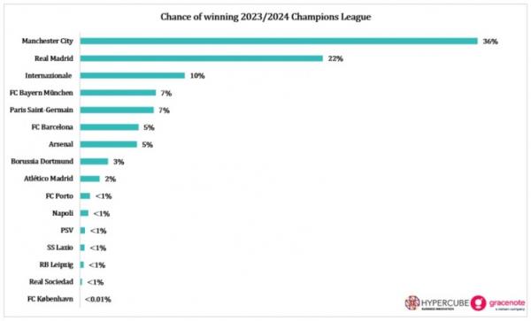此外,波尔图、埃因霍温、那不勒斯、拉齐奥、皇家社会、莱比锡的夺冠概率小于1%,哥本哈根的夺冠概率低于0.01%。