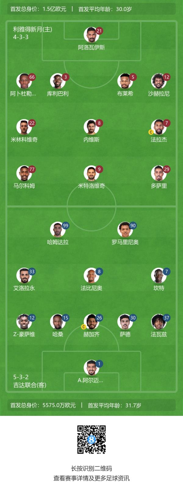 吉达联合首发:1-马约夫、37-萨古尔、30-萨德-穆萨、26-赫加齐、15-卡德什、12-扎卡里亚-豪萨维、33-奥拉扬、7-坎特、8-法比尼奥、90-罗马里尼奥、99-哈姆达拉