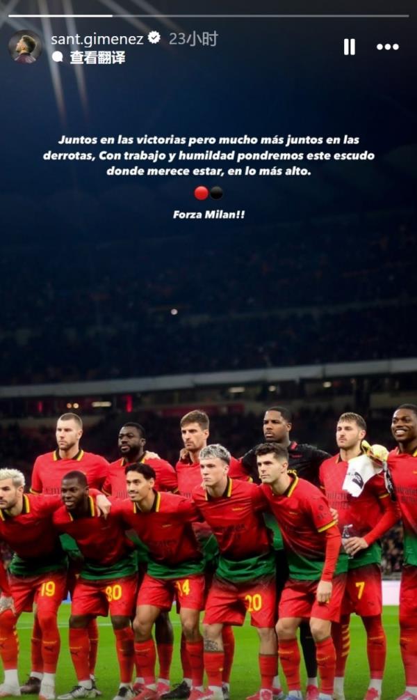 3月5日讯 意甲第27轮,米兰1-2不敌拉齐奥,惨遭联赛三连败。赛后,S-希门尼斯更新社媒,为球队鼓舞士气。