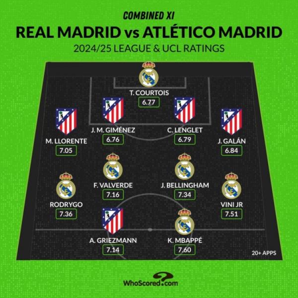 3月5日讯 欧冠16强战迎来焦点战,皇马坐镇主场迎战马竞,whoscored也列出了两队球员本赛季联赛&欧冠的评分合体最佳阵。
