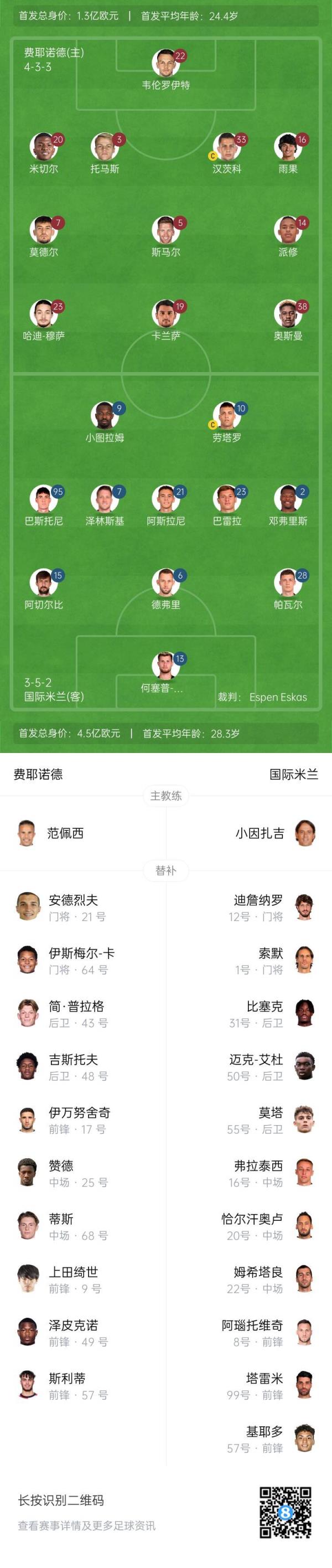 3月6日讯 欧冠1/8决赛首回合,国米客场对阵费耶诺德。赛前,官方公布了本场的首发名单。