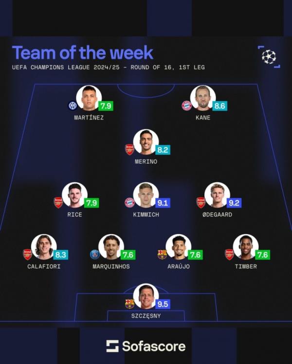 3月7日讯 欧冠16强战首回合已经完赛,sofascore也列出了他们的本轮评分最佳阵容,阿森纳5将在列。