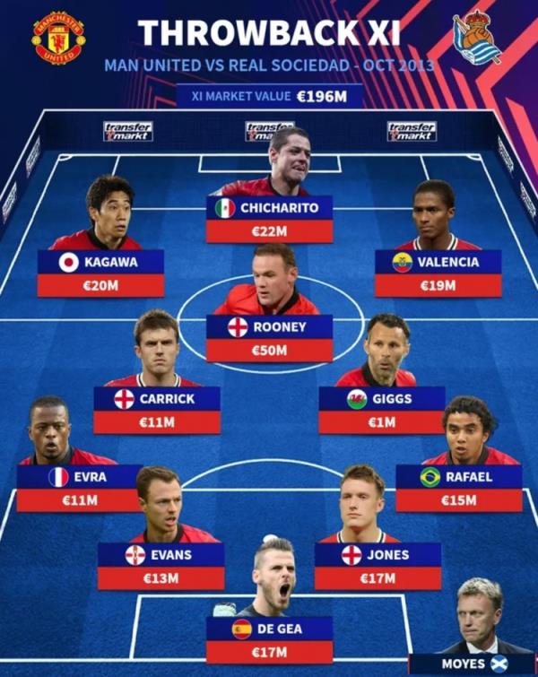 3月7日讯 曼联在本轮欧联杯对阵皇家社会,《转会市场》也列出了曼联在2013年10月队史首次在欧战和皇家社会交手时的首发阵容情况。