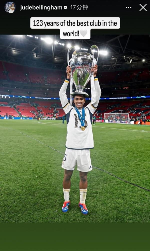贝林厄姆晒出自己高举欧冠奖杯的照片,并写道:世界上最好的俱乐部123岁了!