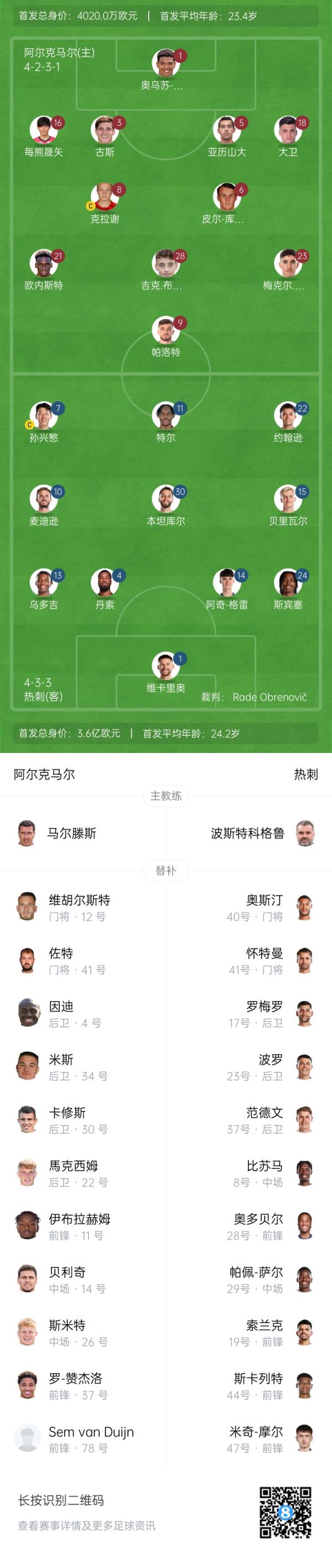 3月7日讯 欧联杯16强首回合,阿尔克马尔主场迎战热刺比赛即将打响。赛前首发出炉。