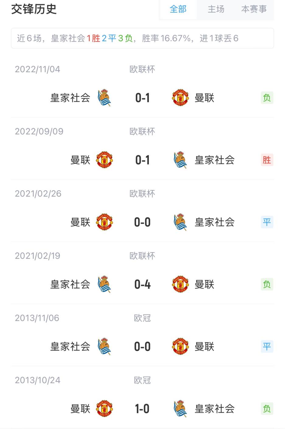 曼联与皇家社会共交手过6次,曼联3胜2平1负。此外,本赛季欧联杯,曼联目前是唯一一支不败球队,他们联赛阶段5胜3平。