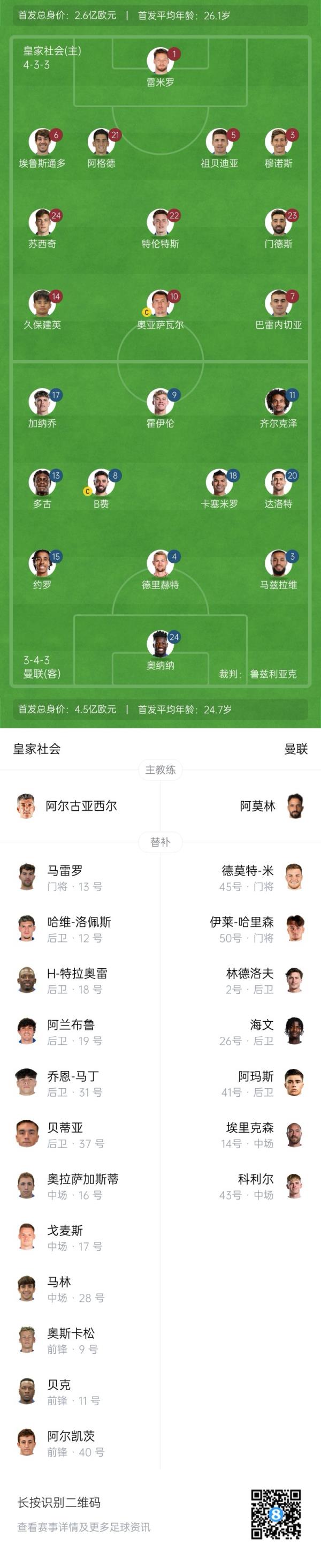 曼联首发:24-奥纳纳、3-马兹拉维、4-德里赫特、13-多古、15-约罗、20-达洛特、8-B费、18-卡塞米罗、9-霍伊伦、11-齐尔克泽、17-加纳乔
