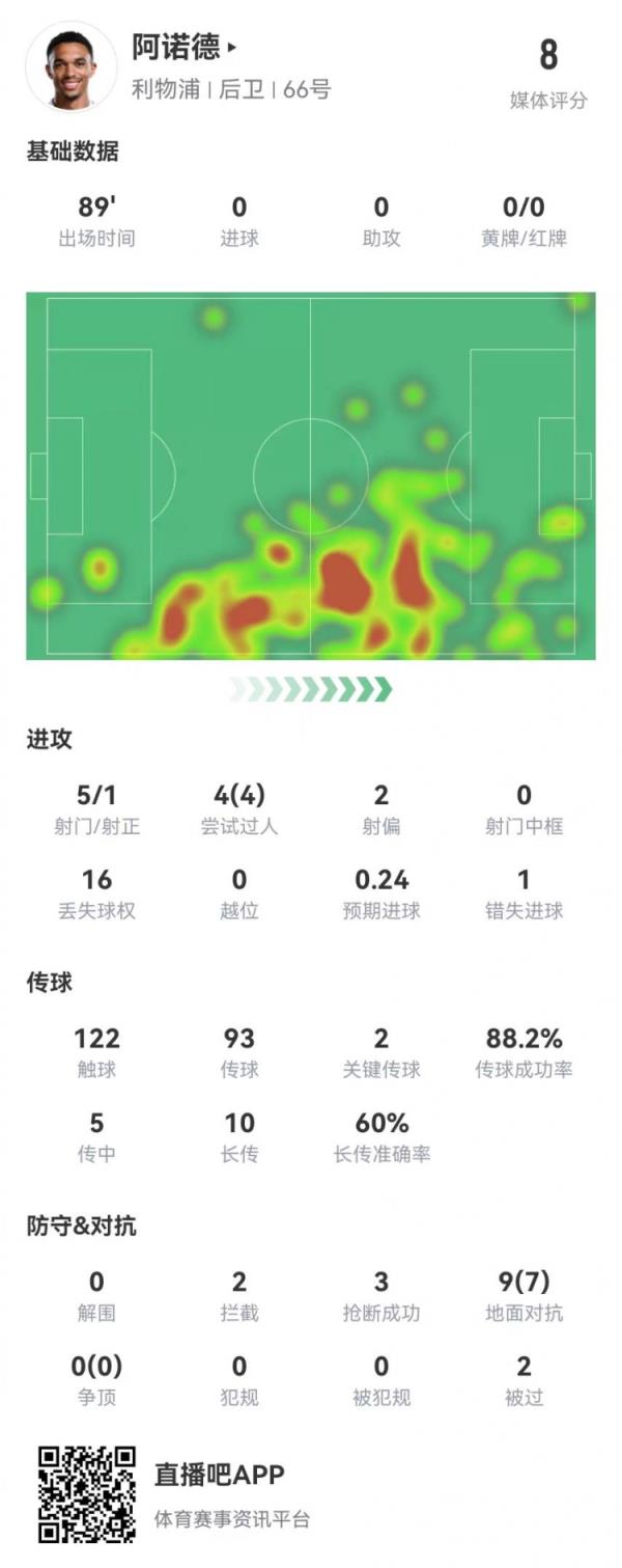 3月9日讯 利物浦在本轮英超3-1逆转南安普顿,阿诺德本场数据如下:
