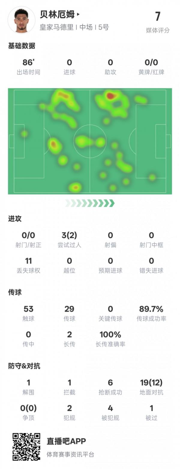 3月10日讯 西甲第27轮,皇马对阵巴列卡诺,贝林厄姆首发出战,2次过人成功,12次地面对抗成功,还有6次抢断,评分7.0。