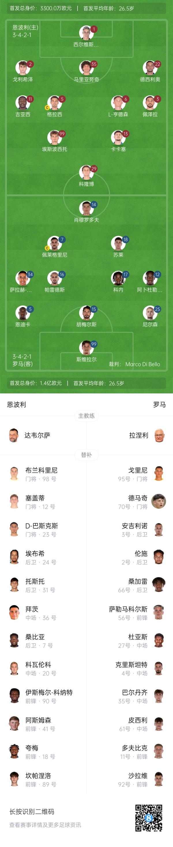 罗马首发:99-斯维拉尔、25-尼尔森、15-胡梅尔斯、5-恩迪卡、12-阿卜杜勒哈米德、17-科内、16-帕雷德斯、34-萨拉赫-埃丁、7-佩莱格里尼、18-苏莱、14-肖穆罗多夫