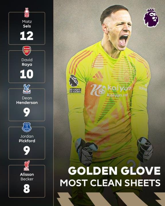 3月11日讯 英超联赛官推今天晒出了金手套海报,诺丁汉森林门将塞尔斯12次零封居首。