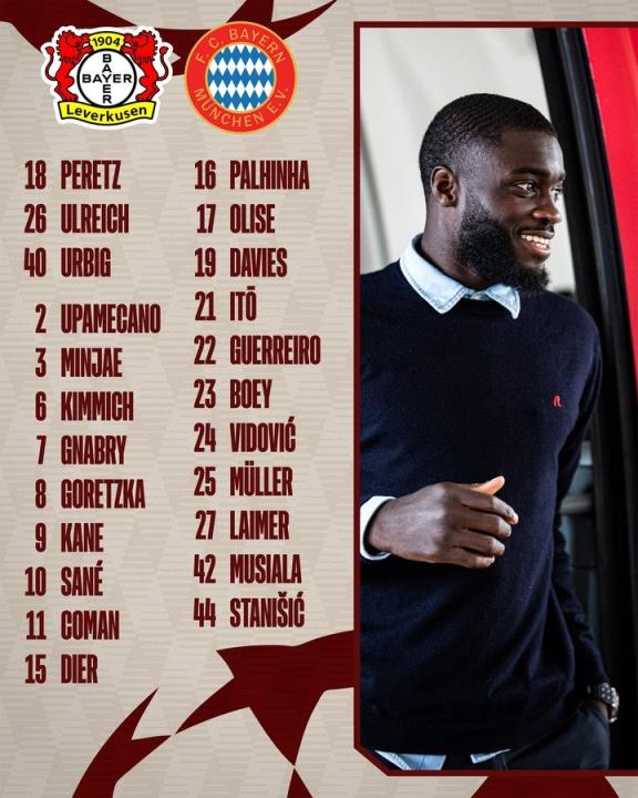 3月11日讯 北京时间3月12日周三凌晨4点,拜仁慕尼黑将在欧冠1/8决赛次回合客场挑战勒沃库森,首回合,拜仁在主场3-0获胜。今天,拜仁公布了次回合大名单,名单如下: