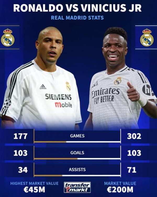 罗纳尔多为皇马出战177场,贡献103球34助攻,巅峰德转身价4500万欧。维尼修斯则在302场为皇马贡献103球71助攻,巅峰德转身价2亿欧。