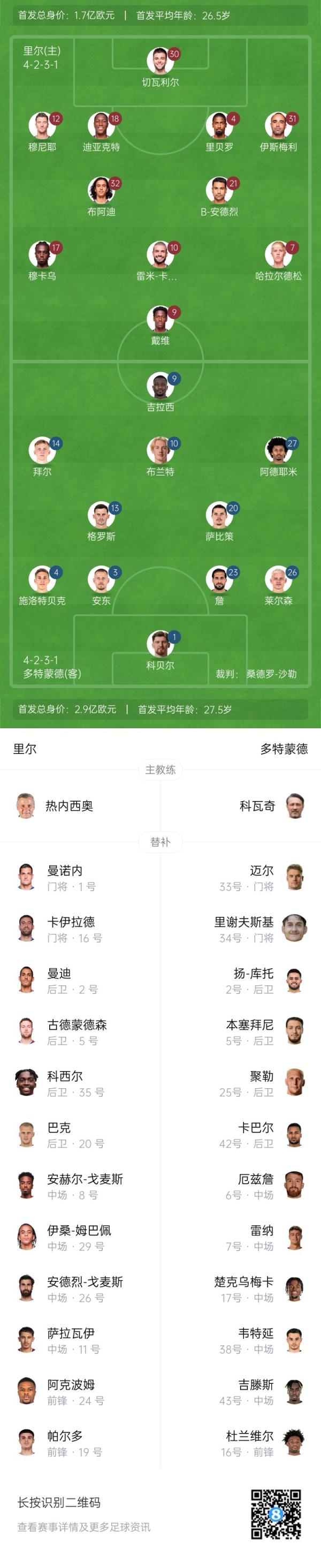 里尔替补:1-曼诺内、16-卡伊拉德、2-曼迪、5-古德蒙德松、35-科西尔、20-巴克、8-安赫尔-戈麦斯、29-伊桑-姆巴佩、26-安德烈-戈麦斯、11-萨拉瓦伊、24-阿克波姆、19-帕尔多
