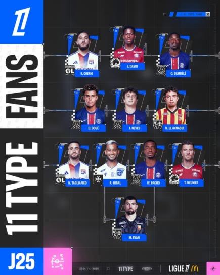 3月13日讯 法甲官方公布了本轮法甲最佳阵,登贝莱、内维斯、杜埃和帕乔入选。