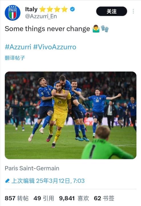 赛后,意大利国家队官推晒出了2020欧洲杯决赛多纳鲁马扑出决胜点球的瞬间,并写道:“有些事情永远都不会改变”。当时意大利队与东道主英格兰队在决赛战至点球大战,三狮军团第4、5顺位出场的桑乔和萨卡的点球都被多纳鲁马挡出,英格兰队无缘队史首座欧洲杯冠军。继那届欧洲杯之后,多纳鲁马再次给英格兰足球送上一记“重击”。