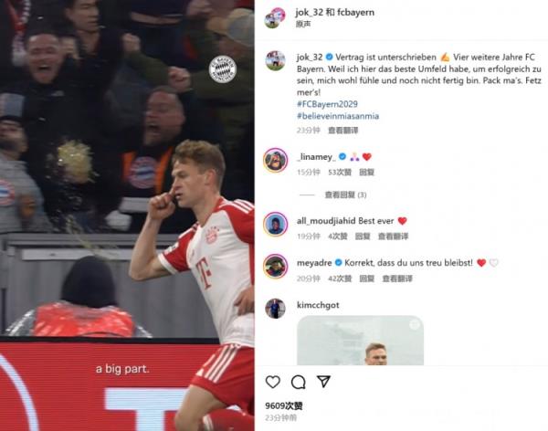 基米希转发了拜仁的官宣视频,并配文:“合同已签署✍️我将在拜仁再战4年。因为这里有我取得成功的最佳环境,我在这里过得很舒服,并且还有任务尚未完成。让我们开始为之努力吧!”