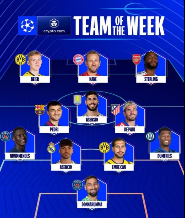 3月14日讯 本轮欧冠战罢,欧冠官方也评选出本轮比赛最佳阵容,凯恩、佩德里领衔,具体阵容如下: