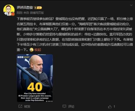 03月16日讯 英超第29轮,曼城主场2-2战平布莱顿,赛后,评述员詹俊在社媒发表点评。