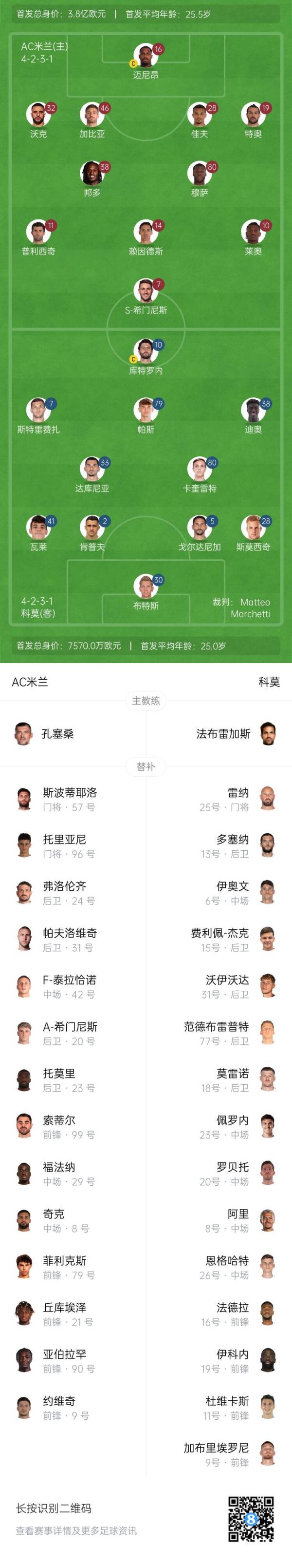 科莫替补:25-雷纳、13-多塞纳、6-伊奥文、15-杰克、31-伊沃伊达、77-范德布雷普特、18-莫雷诺、23-马克西莫-佩罗内、20-罗贝托、8-阿里、26-恩格哈特、16-阿利乌-法德拉、19-伊科内、11-杜维卡斯、9-加布里埃罗尼