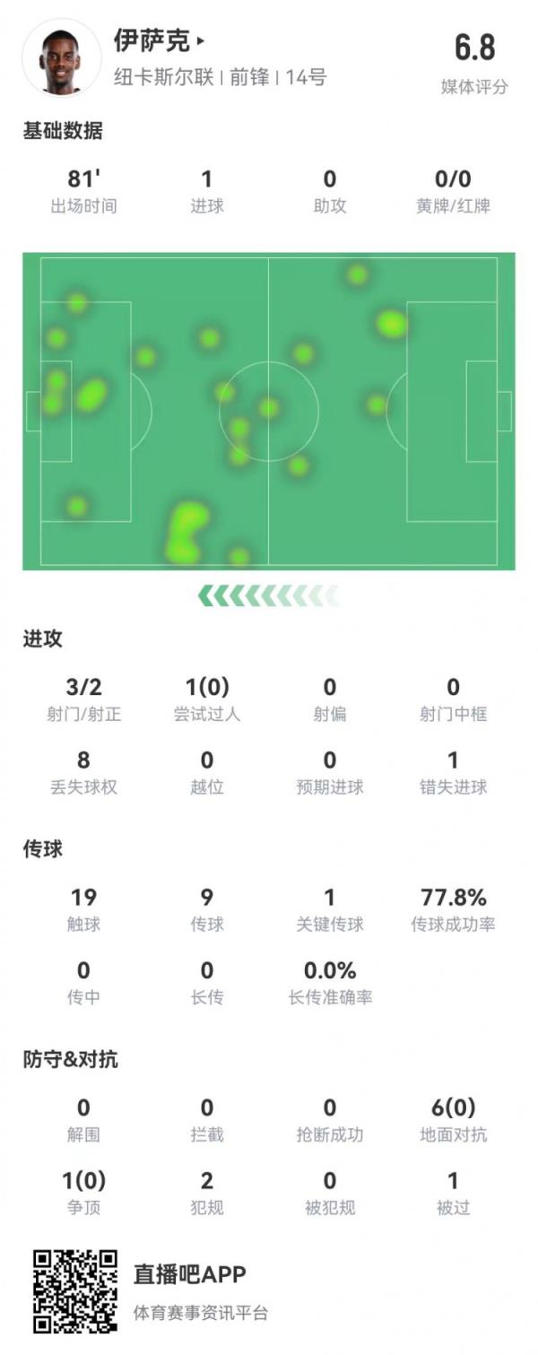 3月17日讯 纽卡在联赛杯决赛2-0领先利物浦,伊萨克本场数据如下: