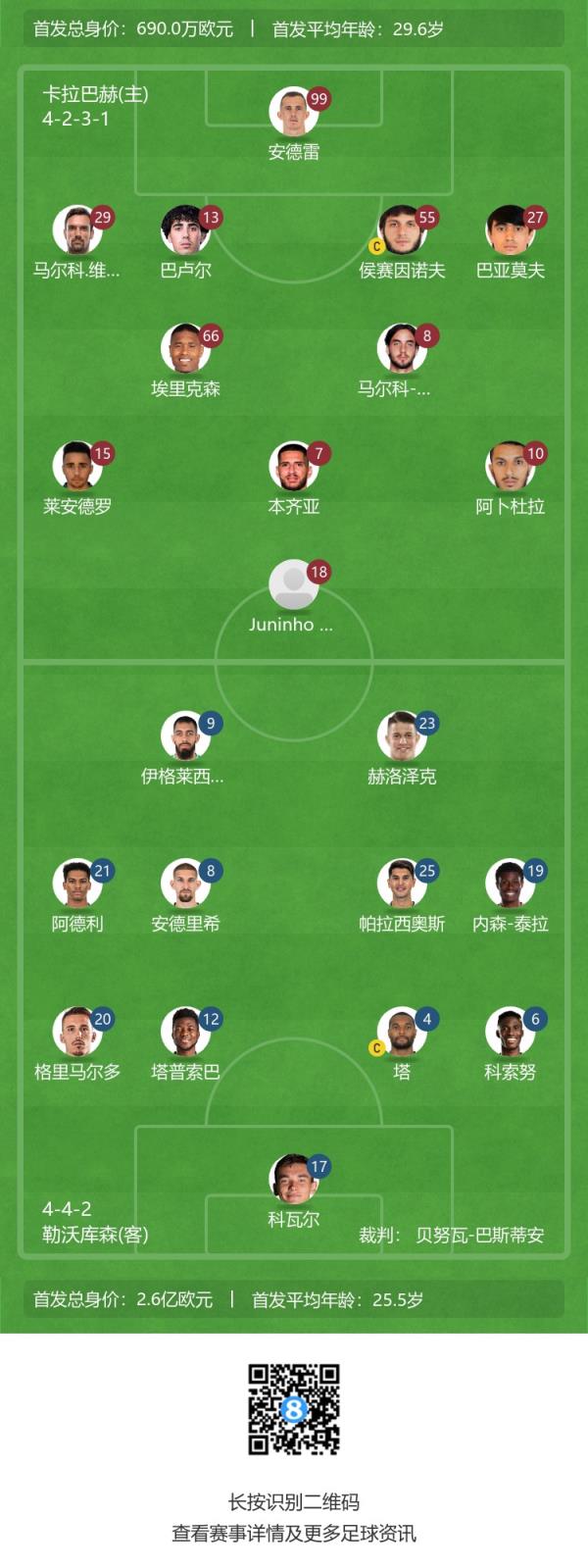 卡拉巴赫首发:99-安德雷、29-维绍维奇、13-巴卢尔、55-侯赛因诺夫、27-巴亚莫夫、66-帕特里克-安德雷德、15-莱安德罗-安德雷德、7-本齐亚、10-阿卜杜拉-祖比尔、18-儒尼尼奥