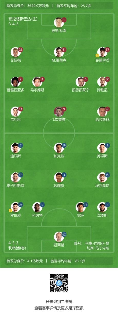 利物浦首发:62-凯莱赫、78-宽萨、5-科纳特、2-乔戈麦斯、26-罗伯逊、3-远藤航、19-埃利奥特、10-麦卡利斯特、7-迪亚斯、9-努涅斯、18-加克波