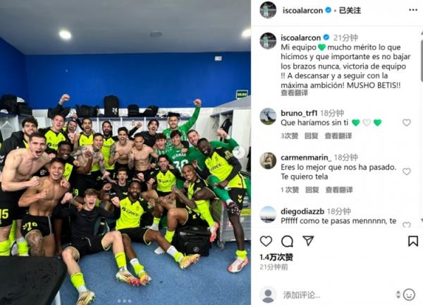 本场比赛伊斯科点射破门拉响反击号角,赛后伊斯科也在社媒晒出更衣室内全队球员庆祝合影,配文写道:“我的球队