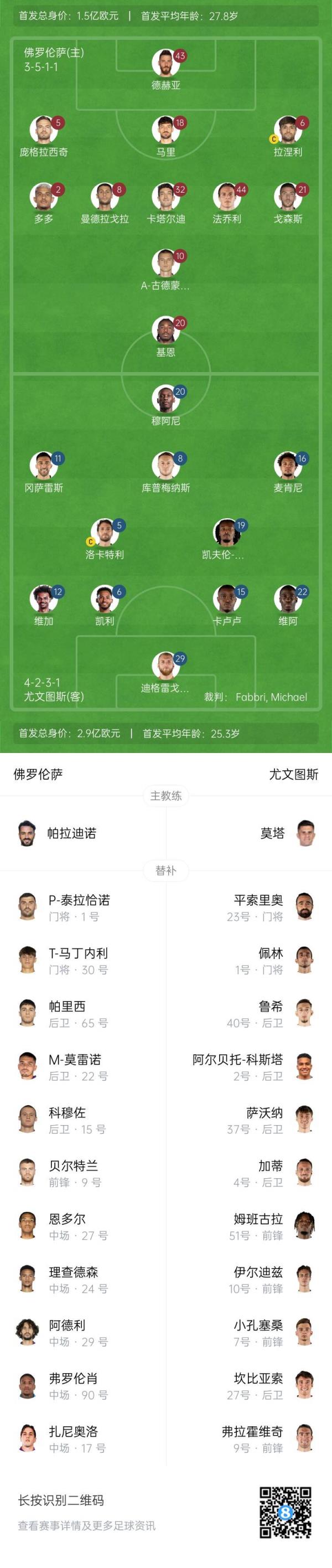 佛罗伦萨首发:43-德赫亚、2-多多、5-庞格拉契奇、6-卢卡-拉涅利、18-马里、21-戈森斯、8-曼德拉戈拉、32-卡塔尔迪、44-法乔利、10-古德蒙德森、20-莫伊塞-基恩