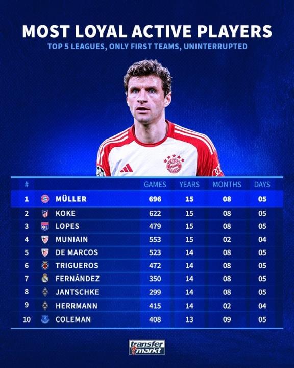 1、穆勒,拜仁,696场,效力15年8个月零5天