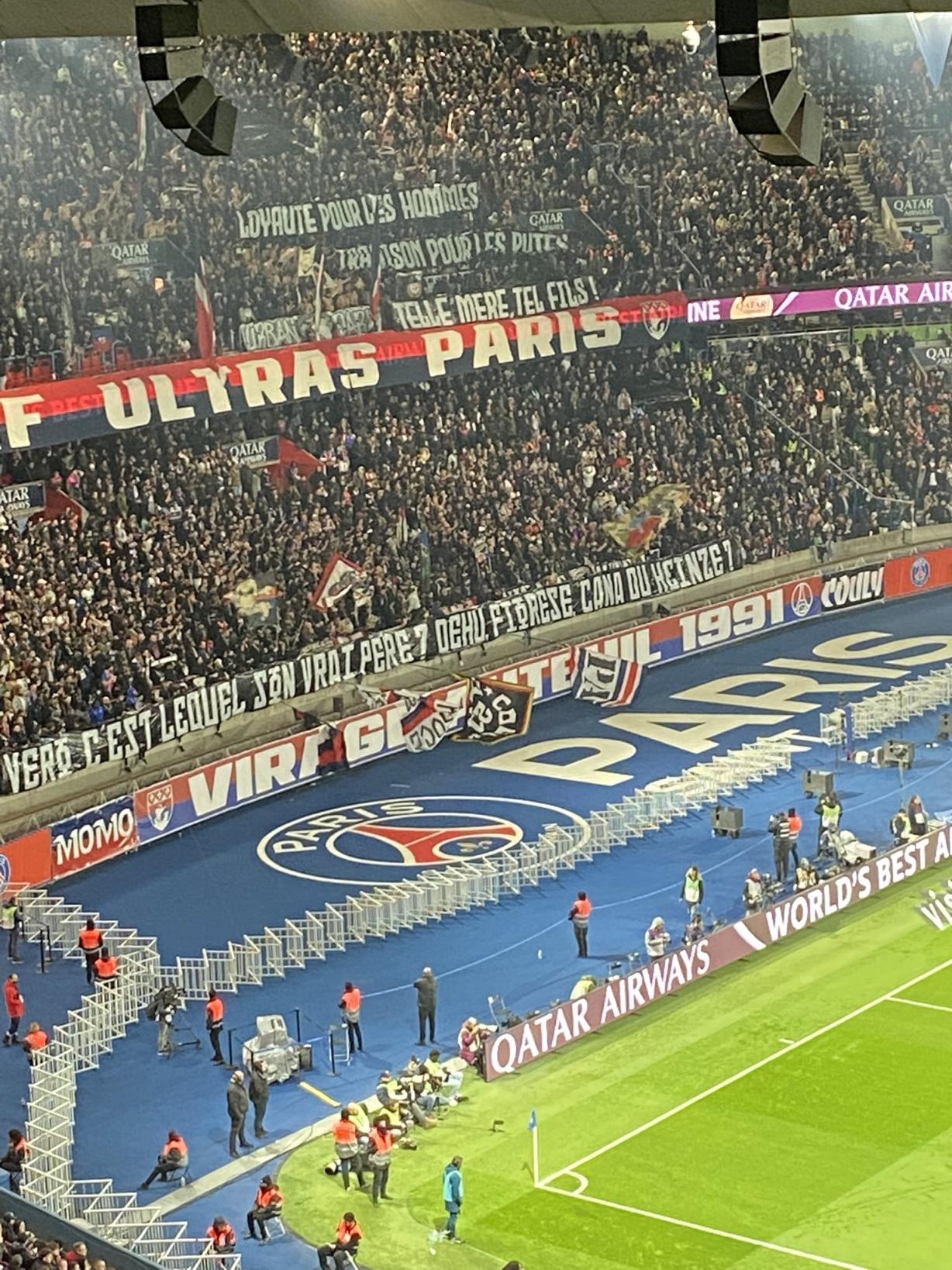 法国国家德比中,巴黎球迷拉出横幅羞辱拉比奥特:忠诚属于男人,背叛属于*子,有其母必有其子。