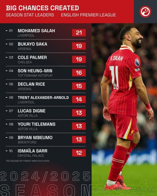 3月18日讯 国家队比赛周到来,英超也暂时告一段落,squakwa统计了本赛季英超创造重大机会情况,萨拉赫居首。