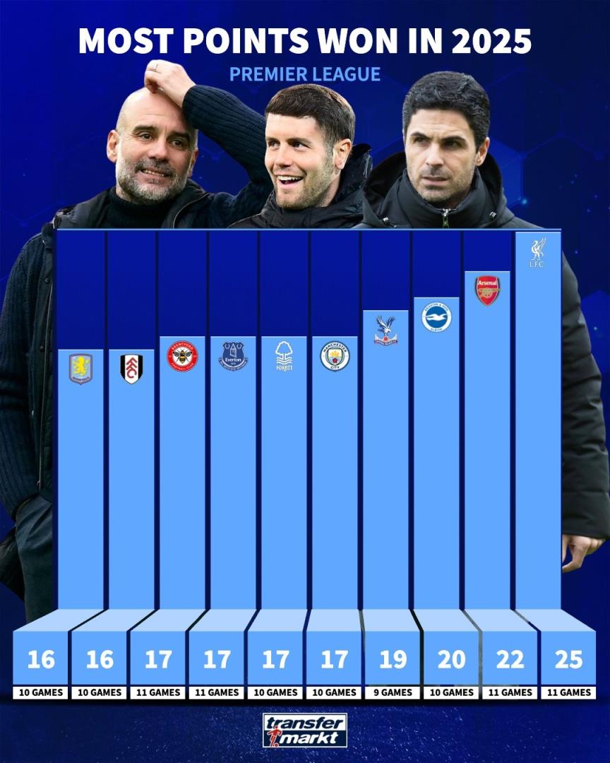 1、利物浦 11场25分