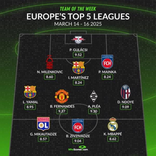 3月18日讯 本周五大联赛已经全部完赛,whoscored也统计了本周五大联赛的最佳评分阵容,B费领衔。